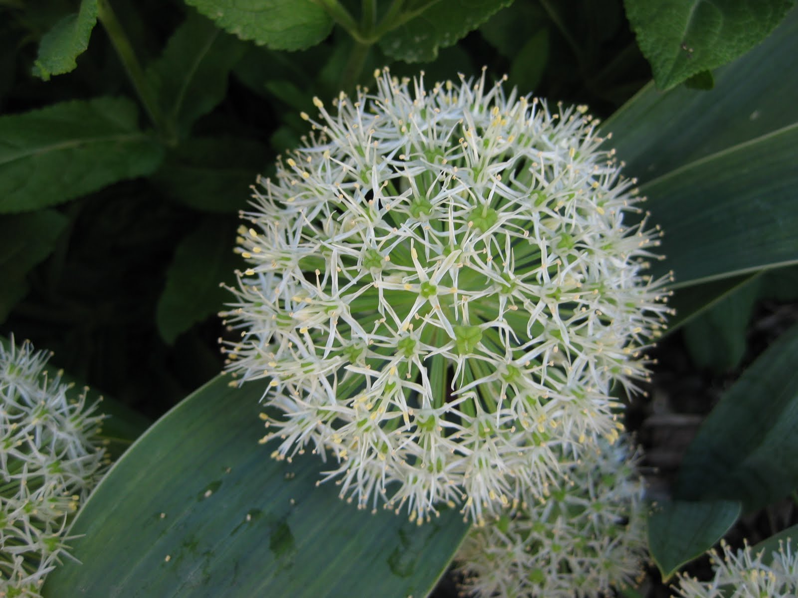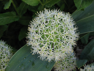 ck outside after our air-conditioned break. Gary and Pat worked on shredded bark mulching while the majority of the guys (Ron W., Ron B., Bob C., Charlie and Roger) helped take down plant sale tables and shuffled plants around the yard before moving to other tasks. Del was a huge help watering. Big John worked on composting while Dick H. and Dick P. lifted some allium bulbs for me from an area that we would like to plant earlier in spring (and not have to wait for the late alliums to finish...). Rollie watered and worked on his bricks while Urban and Maury pruned a willow and moved on to other tasks. Vern, Bob A. and Jim continued work on our new table (for the fancy laser engraver) and continued on an arch down in the wishing well garden. Rose was here to paint and we also had Dr. Yahr, Ken, Dave and many others over here today as well. Nice shot to the left of the very fragrant, variegated mockorange (Philadelphus coronarius 'E.A. Bowles') and to the right, the beautiful flax (Linum perenne) in the herb garden. Flax isn't very long-lived but will reseed. We keep planting it each year as it is quite eye-catching and is a nice shade of blue. I was able to apply herbicide in the woodland walk which has become a weed patch overnight and is now coated in a fine haze of cottonwood "fluff" (see columbines below and note the ground layer looks like snow!). The next picture shows our irises starting to peak but it is interesting how the heat has "washed out" the alliums since Saturday and they will have no color very shortly. Oh well, there are still a couple weeks more of beautiful irises to enjoy regardless.