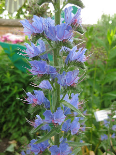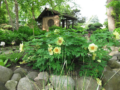 and Sue cleared their portion of that same garden of weeds and will be planting tomorrow. Bill O. was in this morning and later this afternoon for help cleaning up and Maury went on some important errands for us as well. We really have some great volunteers and are fortunate. To the right is a close-up of viper's bugloss (Echium vulgare) in the English cottage garden that always catches attention with tall, colorful spikes. I can't say that I've ever seen our peonies look better although they are also blooming quite early as well. Below is a shot in the fern/moss garden with one of the yellow tree peonies (Paeonia suffruticosa) in the foreground and at the bottom is a beautiful peony called 'Do Tell' in our English cottage garden. I don't think the American Peony Society members will see many peonies when the come on June 4-6 but that's the way Mother Nature rolls sometimes.