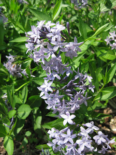 Today was another brutally hot day but we accomplished a lot out in the gardens. By 2 pm we had a downpour which offers moisture but lots of work repairing path washouts tomorrow! Nice shot above of the irises down in the wishing well garden this morning. We've had so many compliments regarding these beautiful perennials and despite them blooming early, they are still being enjoyed by many visitors. John and Larry mowed today with Larry moving on to weedwhipping and other activities. John rototilled and did some watering while Janice worked on many different tasks (planting, watering, etc.). Jenny was in the holding yard all day matching up labels to our plants that will go out in the gardens soon. She is so organized and it is nice to take a plant out with a label so it is easily identifiable and we don't have to "catch up" with a label later. Little Jerry worked on pruning around the Japanese garden and we had time to do our "walk and talk" thru that garden today. One of my favorite underused shrubs can be seen below. This is the fragrant abelia (Abelia mosanensis) that while getting to be about 6' tall and 6' wide, is covered with VERY fragrant pink blooms (seen further below) and it also has a nice orange fall color.