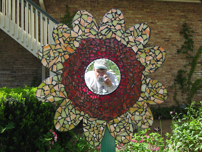 Ajuga reptans 'Burgundy Glow') with blue flowers and variegated leaves. I like this durable groundcover but it "knows no bounds" and will continue to spread..Below is a nice shot of the formal gardens with violet obelisks, irises and allium, all perfectly planned to coordinate. At the bottom is one of our neat daisies with a mirrored center that allowed me to have some face time (look closely).