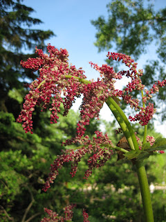 Thalictrum sp.). We are trying to get perennials in the ground prior to the mad rush with annuals. It is now "crazy time" and we hope to have lots of help with planting over the coming weeks and Saturday work days. My day involved lots of tasks and I did a two hour presentation tonite on "Ornamental Edibles" and had a nice and receptive crowd (only 1/2 fell asleep...). Nice shot to the left of the flowers of the ornamental rhubarb (