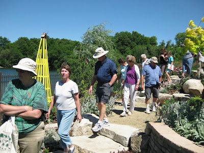 While we didn't have any major trees down in the garden, Larry and the gang spent time cleaning debris up on Saturday. Jumbo Jim had three RECAPPERS and they did a nice job collecting debris and hauled back over 20 large loads of branches. Bill was there helping prepare all the wedding sites prior to the three weddings that missed the storm. There was a scheduled Friday night wedding that probably had to relocate due to the weather. I came in for a couple hours and brought my younger daughter. We gave a tour to the WI/IL Chapter of the North American Rock Garden Society (see below). There were about 10 members and we had a nice walk around the gardens. My daughter met one of the members, a young lady from Turkey that is currently a botany student at UW-Madison, and chatted her ear off.