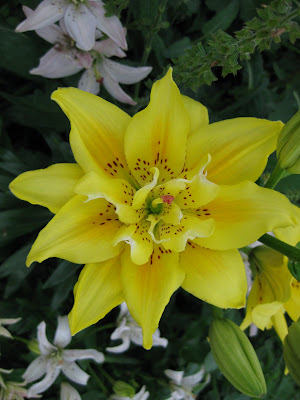 Heliopsis helianthoides 'Loraine Sunshine) that has variable variegation (and reversions to green) but still looks neat to me (30" tall). I probably blogged last October about planting lilies out in my home garden. Well, this double yellow below looks great and I've become re-addicted to lilies (