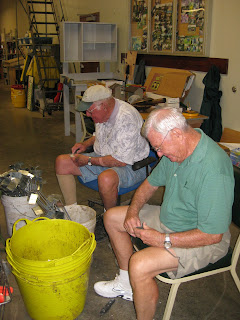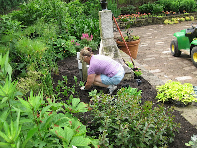 orning, Dr. Yahr and Dr. Gredler worked on peeling labels for reuse in other areas (right). This is a nice rainy day project but with the drizzle fading by mid-morning, we were able to get outside for most of the day. Marianne worked on organizing the Horticulture Center (and it really needed it) and later went out to weed and plant. Marv and Terry bounced between edging, working on water plants, staking and other duties. Big John removed a dead tree, watered, weeded and did a nice job putting in another 100 or so perennials (mostly daylilies) in the main parking lot. It looks like we may get more rain later which will keep everything damp. Little Jerry was here pruning in the Japanese garden and I was able to lay out plants for planting today and tomorrow. We saw Maury, Rollie and Steve today and were fortunate to have Margo (below) come in for some planting in the larch area and sunken garden.