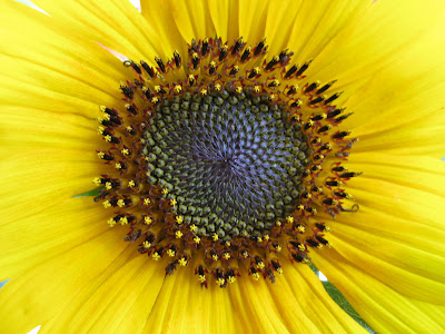 Helianthus annuus) at my house. Look how neat that center pattern appears. The larger outer flower petals (florets) are called the sterile ray florets. The fertile disk florets are clustered in the center and become seed after being fertilized. Don't ever hesitate to observe flowers up close. They are so neat. I learned that the spiral arrangement of the center of a sunflower follows a mathematical model. Sunflowers are tough and can extract nasty substances from the soil (lead, arsenic, etc.). Sunflowers were planted en masse around the Chernobyl nuclear event to help extract uranium from the soil. Interesting..