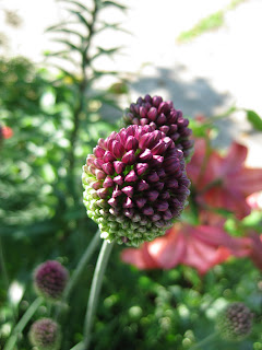 Allium sphaerocephalon) that has a neat ovoid umbel that opens up a nice deep "pinkish-maroon". This is a great partner plant to "shoe horn" in each fall (fall planted bulb) with the understanding that it blooms in July at 30" tall and may reseed in open soils. We've moved them from areas that we need to plant with annuals as we don't want to wait too long to plant. The drumstick allium comes as inexpensive bulbs in the fall and looks great in tight groupings. Below is the beautiful 'Gartenmeister' fuchsia (