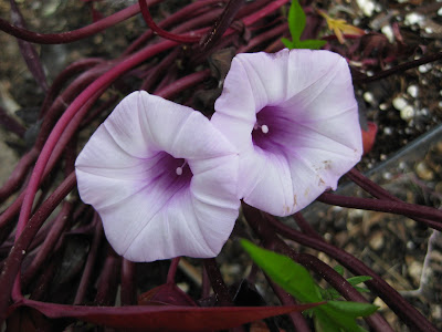Ipomoea batatas 'Illusion Midnight Lace'). My initial thought was, "Wow, how did those petunias get in there?", of course, not realizing that they were the blooms of the sweet potato vine which I had never before seen. NEAT - O. I think the warm treatment at our grower's greenhouse encouraged these exquisite blooms. The bottom picture is another sunset masterpiece from Santos.