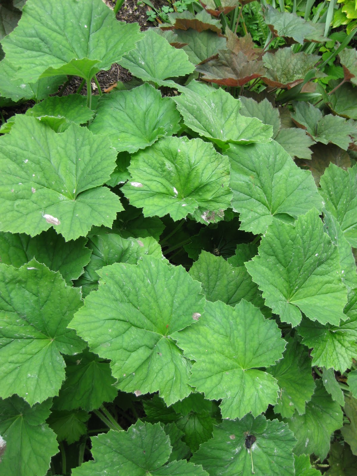 Catalpa bignonioides 'Aurea') sprouting up in the fern & moss garden. With the potential to become quite large, we cut this tree back down to a 12" tall grouping of stumps every winter so we get lush growth with large tropical leaves each year. We have three of these out in the gardens, treat them all the same each year with the severe cutback, and they all spring up 10' tall in one growing season. I have one at home too. I love the tropical look. Above and to the right is the hairy alumroot (