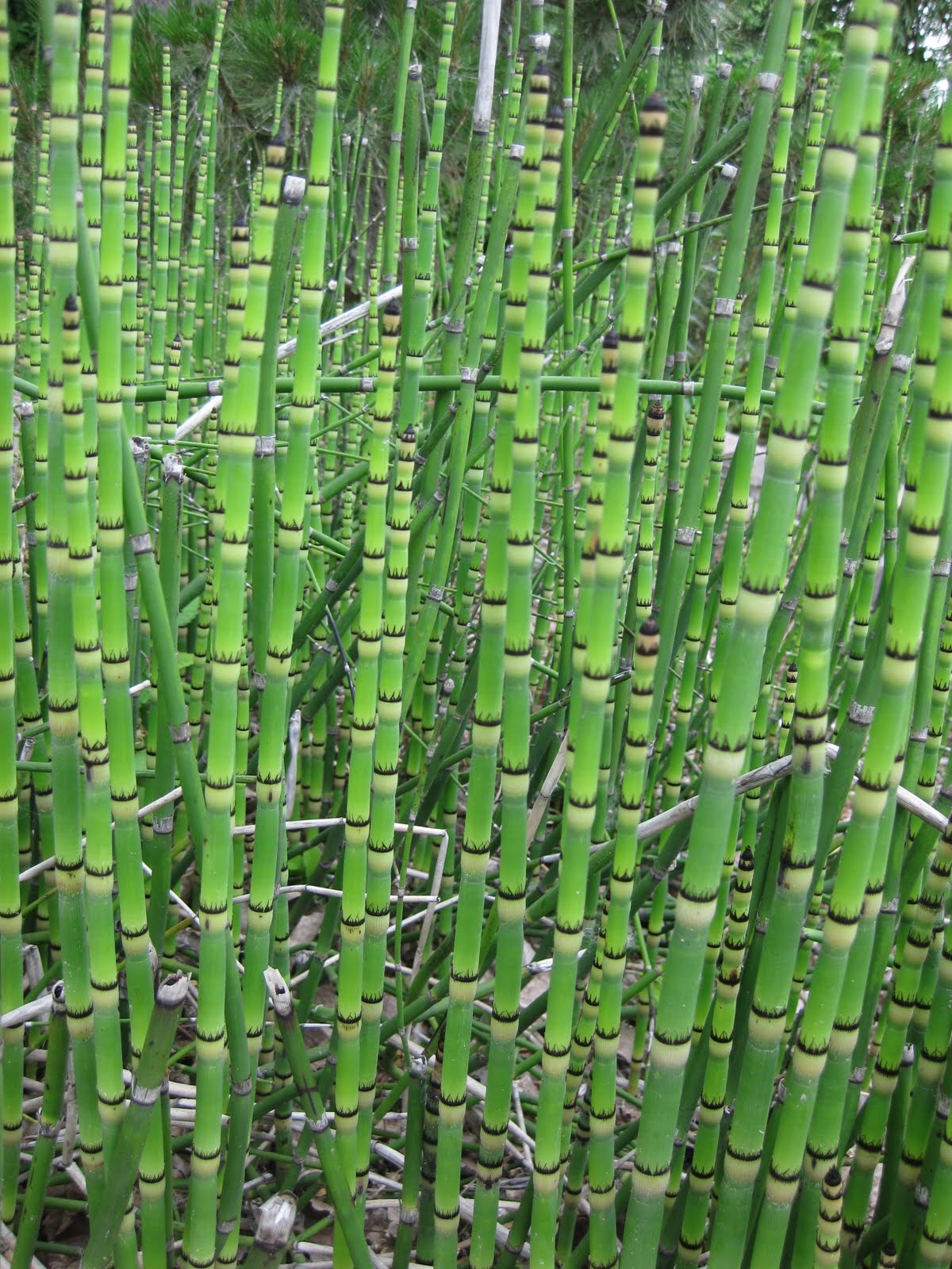 Equisetum sp.) along the pond near the fern & moss garden. This primitive plant has a 400 million year history and was also called "scouring rush" by early pioneers who would use it to scrub pots and pans because of it's rough texture. It was also called "tinker toy plant" because children could take apart the sections and place them back together. This patch pre-dates the garden and is quite interesting to view. Be warned,