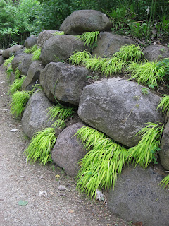 Hakonechla macra 'All Gold') that we put in the gaps between these boulders many years ago. I can't wait to see this entire wall look like a golden waterfall in a couple of years. Below is the pink globeflower (