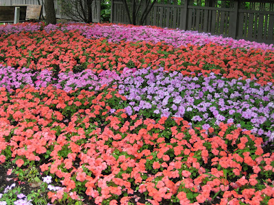 come less reliant of flowers and more dependent on foliage. To the right is a hybrid toadflax (Linaria hybrida 'Enchantment') with fragrant, magenta and gold blossoms. This annual looks great in the cooler months of the growing season and tends to wimp out in July and August. What a vivid color though. I estimate that we are about 86.4% planted with our annuals and should be able to finish the rest next week if we aren't too rained out. We still have a dozen trees and shrubs and a couple hundred perennials to put in but this has been a record spring for planting due to such wonderful volunteers. I'm "off" tomorrow but will be here to give a tour to the WI/IL Chapter of the American Rock Garden Society. Should be fun. Our 2010 "impatiens swirl" below, layed out by Marianne. Looks sweet.