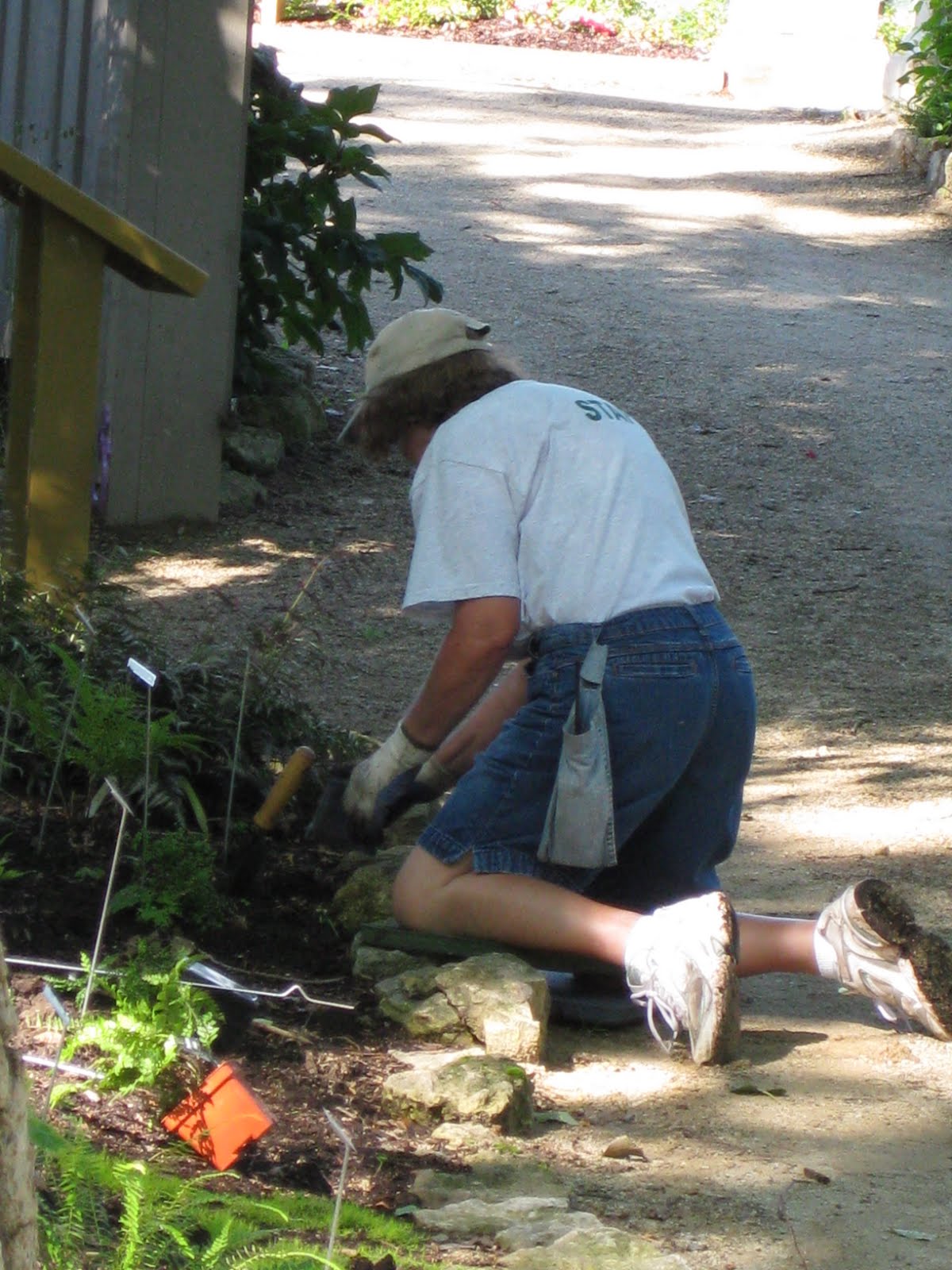 Aside from planting ferns, Marv also worked on running irrigation, pulling thistle and various other tasks. Marianne also planted more containers, did her cutting display, weeded and tidied up here and there. Dr. Gredler was here mowing and we had Shirley and her g