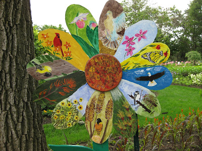 Lagenaria sp.) stretching out for something to grab. Two days ago, these DID NOT have those "grabbers" but the plant realizes it needs to cling and gain some height or be left as a groundcover. It is interesting to see the "life" that many climbers display as they seem determined to find something in range and strech towards the sun. Nice shot of another daisy project below. We planted flowers around most to help augment the display. We still see lots of visitors enjoying this additional garden feature.