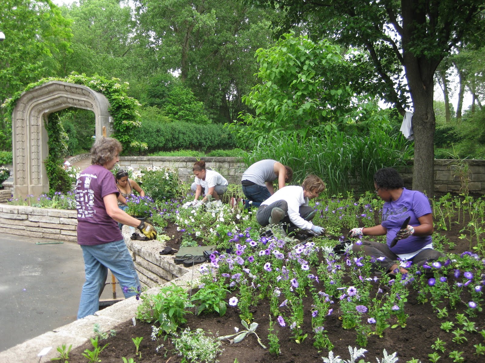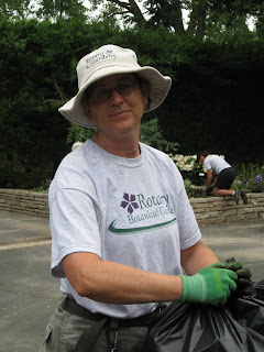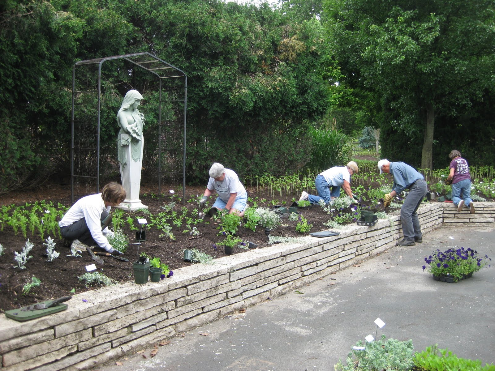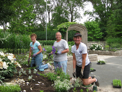 flower displays. It was "mass congestion" but everyone was quite good natured (as most plant people are anyway). It was crazy. With two impending weddings (one in the pouring rain this afternoon), we opened the gates to accomodate all the comings and goings. Larry was a huge help today and we had Bill here tidying up wedding sites, collecting garbage, etc. Dr. Gredler was here too and we saw Vern and Maury as well. Nice shot to the left of Janice. Note how here eyes are saying, "I have an idea what you can do with your camera...". To the right is Del helping with planting. Look at those calf muscles for an old guy! Below are Gary, Cindy and Maggie. Our volunteers are a happy lot and more appreciated then they'll ever know.