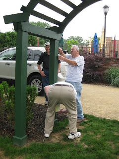 refreshing an older path with fresh gravel in the Hosta Hollow garden. Pat and Ron B. did a nice job along our east parking lot with weeding, mulching and tidying up that end of the garden. Gary and Maury helped organize the yard and moved on to other duties. The carpenters were down working on the new arbor and sizing up future gates (see Jim, Vern and Dave's lower torso to the right..). Those guys are so darn handy. Big John cleared a coastal area of weeds and mulched around our desireable plantings. He later shifted to planting with the gang and does a nice job keeping things moving along. He was a huge help Saturday too and is growing on us (like a fungus). Dr. Yahr and Avis (see below) did a nice job planting in the wishing well garden and we hope to finish that space later this week if possible. We also saw Geesje, Mike, Dave, Bev and of course Dr. Gredler. The iris beds in this space, once the irises are cleared out and divided, will be planted with annuals in mid-July for colorful filler (using donated annuals from area nurseries). The two bottom photos show another great garden perennial called yellow meadowrue (Thalictrum flavum ssp. glaucum) that not only has the contribution of showy yellow flower clusters in June thru July, but also sky blue foliage. This perennial tops out at about 48" in damp (moisture essential), full sun although it will tolerate part shade as well.