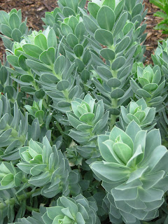 job and worked thru the drizzle to install 300 annuals in this space with just a couple more to go along the front of the path. The scary thing is that they not only match clothes when they volunteer but all the time!? :) Good folks. We had two new volunteers today, Beth and Ronnie, who jumped right in to planting with Mary, Mary, John, Gary and Ron. They did a great job and Peg K. was in the English cottage garden tidying up as well. Jumbo Jim was here later with RECAPPERS and they were very helpful as always. Nice shot of donkeytail spurge (Euphorbia myrsinites) which has such an interesting look after the early chartreuse flowers fade. This perennial is a thug in other climates but a nice edging perennial for us.The Grumpies were well represented today with Del and Ron W. jumping right in to composting and Urban and Charlie worked on skimming up gravel and