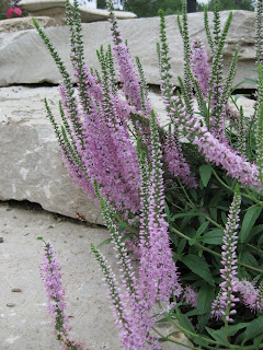 in front of the visitors center and also did work in the Japanese garden. Janice and Marianne worked on their respective projects (indoors and outdoors) while Larry spent the day with the string trimmer hitting all those "hard to reach" shaggy spots. He mentioned how heavy that trimmer was by the end of the day and the wet grass attached to his pants added another 20 lbs. I'm sure! I was able to lay out another couple thousand annuals, most of which were planted before the rains really settled in for the afternoon. I'm also working on our Home Garden Tour and starting preparations already for our fall plant sale. Both plants shown here were also in the wishing well garden and are showy perennials selected for a long "bloom window." To the left is the pink speedwell (Veronica spicata 'Fairytale') with upright flower clusters thru mid-summer and to the right is the dwarf wood betony (Stachys monieri 'Hummelo') which is one of my top 10 favorite perennials for full sun (will take part shade too though). These little violet-pink "bottlebrush-like" blooms are very long lasting and the foliage of this plant always looks good.