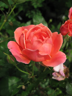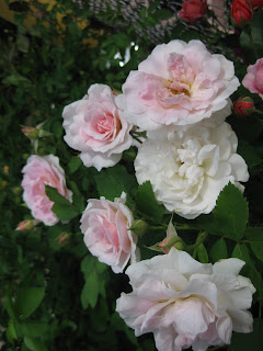 Filipendula rubra 'Venusta Magnifica') starting to bloom with wonderful pink flower clusters. This native perennial prefers damp, full sun locations and tops out at almost 5' tall. The threat of rain with cool breezes and a dark sky this morning prompted some quick activity out in the gardens as we thought our time might be cut short. Janice and Terry mowed right away as did Dr. Gredler and Little Jerry (who later pruned too). Marianne, Marv, Terry and I hauled out plants for the planting work day tomorrow which looks favorable as rains should come later in the day tomorrow. It's going to be a hot one though! I placed around 10,000 annuals out in our entrance garden and we'll hit the ground running in the morning. Marv and Terry also removed juniper stumps, rototilled and prepared more beds for planting (next week) and cleaned up garden areas for the weddings. We had three weddings scheduled for tonight which is remarkable for a Friday. Five outdoor weddings in the gardens tomorrow! Marianne did lots of weeding today, fertilized some annual beds, assembled the cutting display and watered. Janice did a nice job watering in the plants we installed yesterday (glad we didn't let it go) and worked on various projects. Overall it was a very productive day. I took the rose picture below in our yard as it caught my eye immediately. This is