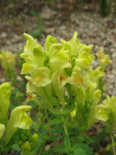 Scutellaria orientalis) that caught my eye in the alpine garden with exquisite, chartreuse yellow blooms. On June 19th, the WI/IL Chapter of the North American Rock Garden Society will be coming thru the gardens for a tour (with me) so we're tidying up in that space and Iza was here planting more alpine plants this afternoon. At the bottom is a picture of another neat shrub rose in our collection. This vivid rose is the Showtime shrub rose (