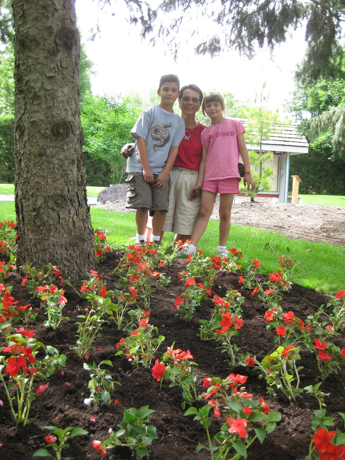 ervousness about being rained out over the coming days so we had lots of help today. To the left is Judy with Alex and Sadie. They planted some orange impatiens and helped the entrance garden planting crew plant our red/maroon theme annuals. The kids have helped in the past and grandma Judy is quite a gardener herself and her home garden (beautiful) has been on our Home Garden Tour in the past. To the right is Ro