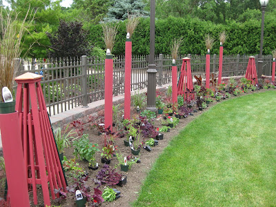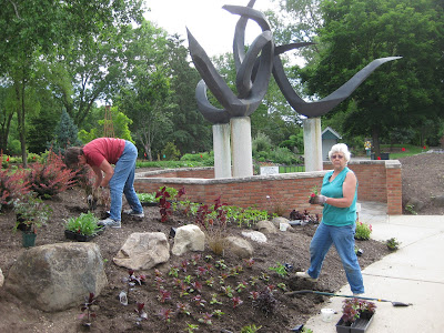 n W. (Bev's better half) who has become our "go to" guy for a variety of projects and has great attention to detail. Any project Ron is involved with is done right. If our momentum continues with planting, we should be done by the end of the month and are also trying to finish planting our perennials, trees and shrubs. I like to have an empty yard in July so we can focus on the gardens. We try to avoid any planting in July and August if at all possible. The recent rains have encouraged some major weeds but we'll catch up with those later this month. Below is Marilyn and Suzy planting near our 'Dialogue' sculpture. I really feel good about this red/maroon theme and think it will be quite impressive once it fills in over the coming weeks. Keeping everything watered, fertilized and maintained will be the challenge in this entrance area which is our "front door" for visitors.