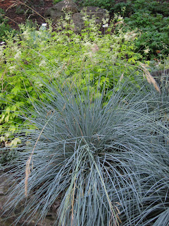 Helictotrichon sempervirens 'Sapphire'). You can't go wrong with blue and yellow. Little Jerry did a lot of pruning here and there and worked in the Japanese garden as well. Marianne started the day by "roughing up" our cocoa bean hull mulch around the roses that was beginning to form mold from all the moisture. She moved on to tidying, weeding and continues to plant small gaps in the entrance garden. For three years now she has been maintaining our "front door garden" and does a superb job. Marv and Terry bounced between mulching, planting trees, planting annuals and other projects. Big John worked on composting, weeding, planting roses and mulching. I was able to spray a couple loads of herbicide today as it may be my only window until late next week. Kay was here (upper right) and continued to tackle our weedy shade garden with a thorough approach. I told her that she is one of the very few volunteers that has the patience to deal with such a large (depressing) area of weeds and do such a nice job without going insane. Shirley was back in action and personally weeded and planted 3/4 of the color rooms garden. Jumbo Jim came in with two RECAPPERS and they helped Little Jerry, weeded the roses and tidied up our alpine gardens prior to our Saturday tour by the rock garden society folks. Nice shot below of a neat alumroot (