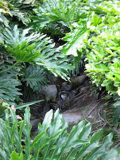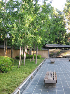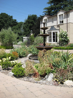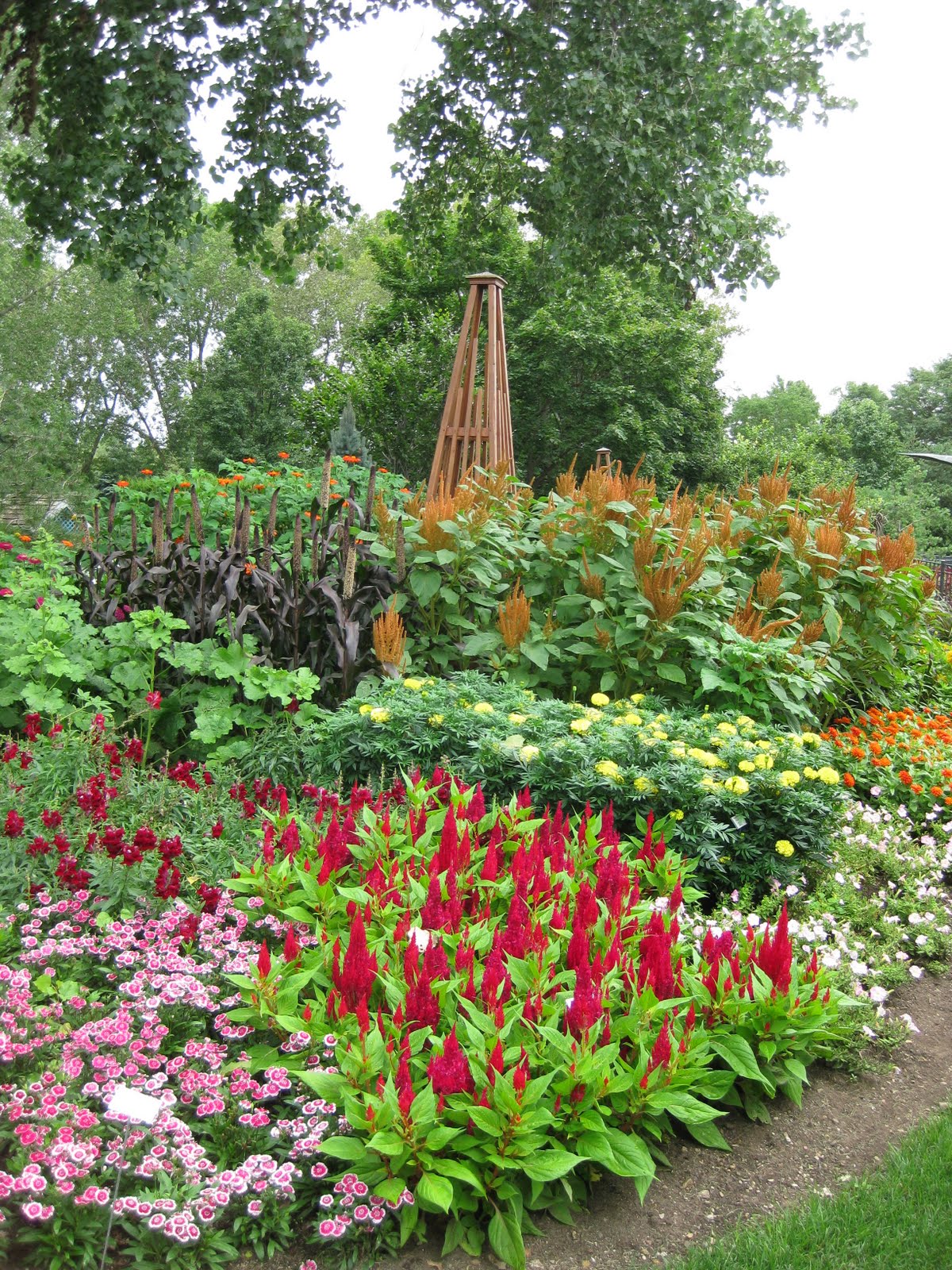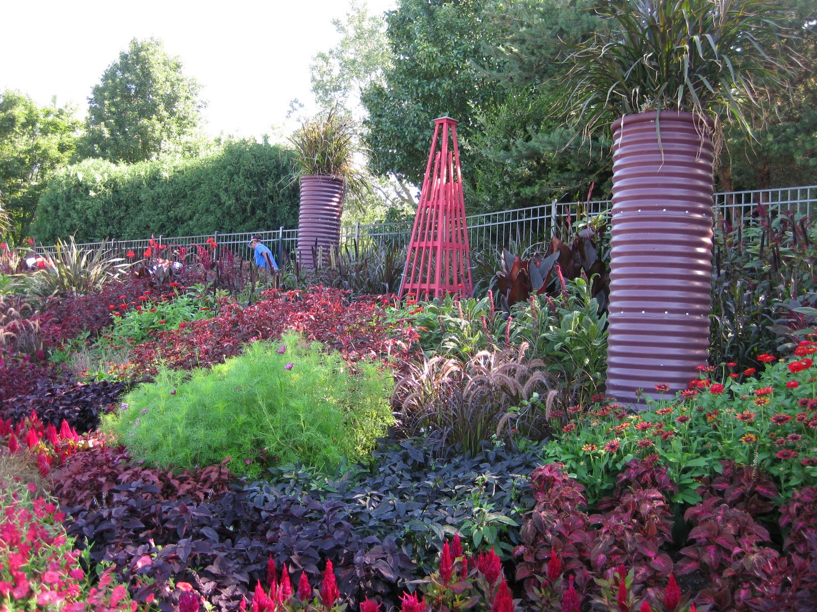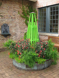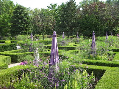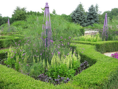 Today was another hot and sunny day but with all the precipitation from last week, plants are really hitting stride now (including the weeds unfortunately). Nice shot above of the Adirondak chairs in our wishing well garden. I think these are the most used seats out in the gardens and offer a nice view of that space as well as the pond. I'm still catching up with various projects and we continue to focus our weeding efforts around the gardens to keep up with the onslaught. Below are the formal annual sections that while not having as much "punch" as they've had in the past (in terms of bright coloration), they have a nice pastel look with lavender, chartreuse and some burgundy. The painted obelisks are certainly nice punctuation.