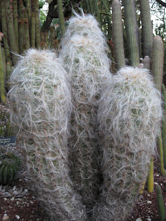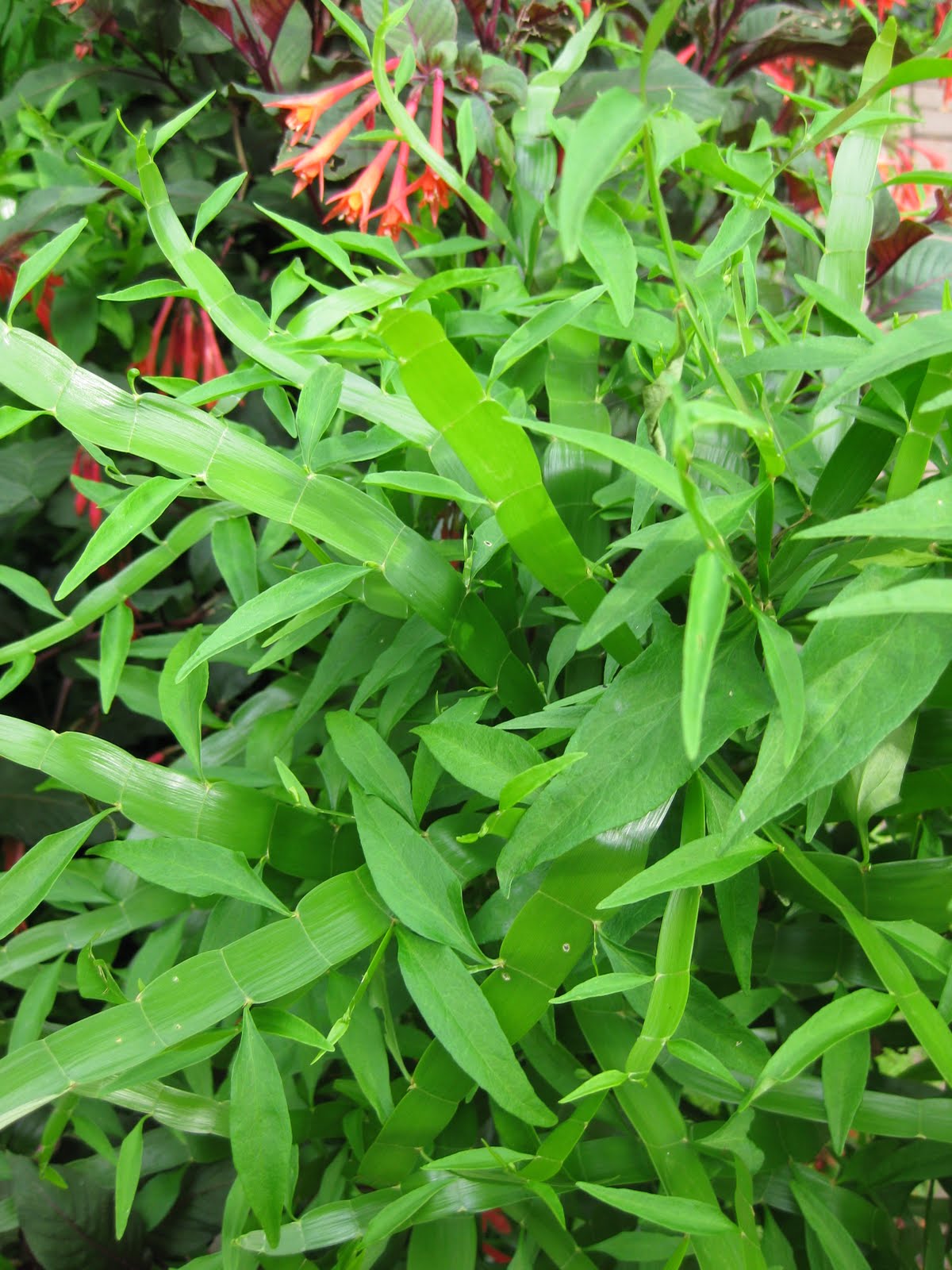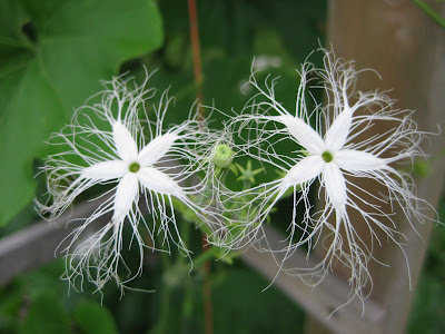 ergrown perennials from an area and composted the space for later planting next week. He ran irrigation all day and was the maestro at moving around sprinklers. Marianne tidied up some container displays, watered, weeded and did her cutting display as well. No one ran out of work today. We saw Mary H. out weeding her area and Dr. Gredler was here too (mowing, etc.). We also saw Maury, Big John, Bill and Dave T. today. To the left is our copper cheese vat planter with a hodge podge of annuals around a center obelisk. To the right is a close-up of a very interesting plant called ribbon bush (Homalocladium platycladum) that is part of that container planting as well. The jointed stems are quite interesting and textural. This plant is also called centipede plant and my favorite name, tapeworm plant. Native to New Guinea and the Solomon Islands, this plant is quite shade tolerant and the blooms are small and incidental. I had never grown ribbon bush so put it in some interesting test locations where it looks funky. We have it in three hanging baskets where it has grown 24" or so and is irregularly floppy and not as sightly as it is in beds or containers. Regardless, it is certainly a conversation piece. Not long ago I showed a close-up of Mexican sunflower (Tithonia rotundifolia 'Torch') with bright, deep orange blooms on a tall, 72"+ plant. Below is a bloom close-up of 'Yellow Torch'. Shouldn't be long before the butterflies find this beauty. In our gourd collection this morning, I noticed the most exquisite blooms on the 'Polo' gourd (Trichosanthes anguina). See below. This is a snake-type gourd that is edible (quite nutritious) when young but can be used for crafts later when it toughens up. There have been many traditional herbal uses for this plant and it is a common vegetable in east Africa and tropical Asia. Cool blooms.Thursday, July 29, 2010