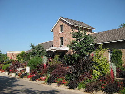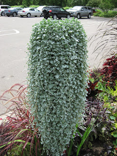 nce to them. We actually kept up with some irrigation to make sure some of our areas don't dry out and thereby become increasingly more difficult to keep wet. The shot to the left is of the aluminum plant (Dichondra argentea 'Silver Falls') cascading over one of our shorter red, PVC pillars out in the entrance garden. This is the look we wanted with the entire pillar eventually becoming silver. The taller "pillar planters" have a ways to go but hopefully will get there by the end of August. Our annual beds are really peaking as seen to the right. We're continually weeding these spaces and are deadheading as needed to extend color thru the rest of the summer in to early fall. Below is another shot taken today in front of the building. I think the maroon/red theme has been wildly successful and we've had lots of positive comments regarding the appearance. Marianne does a dynamite job of keeping our "front door garden" looking nice and tidy all the time and this image is a true testament to the value of ornamental ANNUAL grasses (purple fountain grass, 'Fireworks' fountain grass and purple elephant grass).