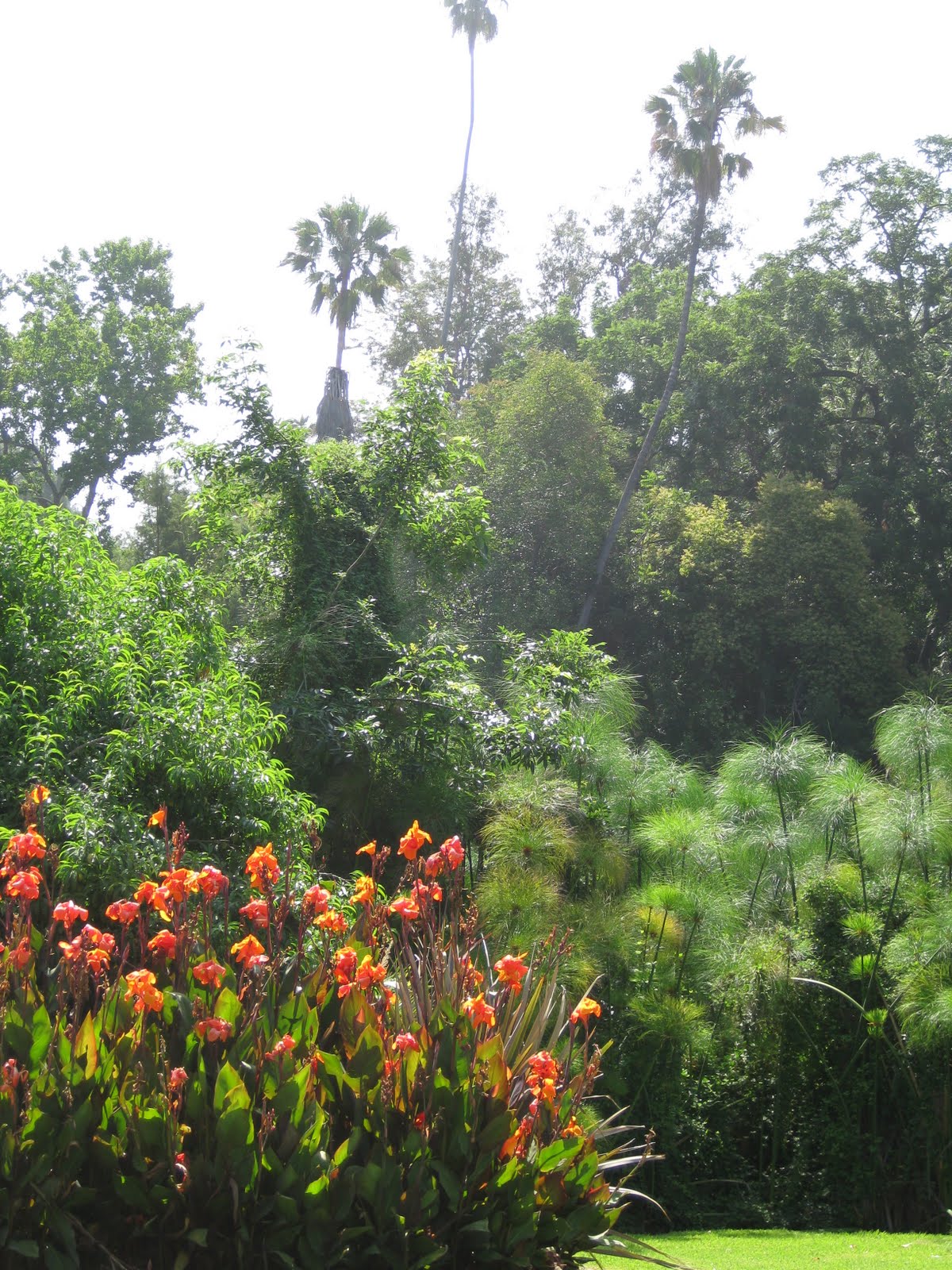 s. To the left are some of our pergola planters with a simple arrangement. The centerpieces are 'Fireworks' fountain grass (Pennisetum 'Fireworks') with the neat trailing aluminum plant (Dichondra argentea 'Silver Falls') that really adds a nice "spilling over" touch to these containers. To the right is a close-up of this tough, annual trailer and groundcover. It will be interesting to see how far the aluminum plant cascades to the ground. We keep fertilizing it in the hopes that it will eventually touch the ground. Below are our resurrection lilies (Lycoris squamigera) blooming in full force (normally a mid-August bloomer). They really are quite exquisite when you get close and usually blend well with surrounding plants as they gain height on leafless flower stalks (the foliage comes up in spring, photosynthesizes, then goes dormant). Further down is my favorite dark-leaved canna. This is 'Australia' and is the darkest foliaged canna and has nice deep red flowers. This clump looks pretty good but others have been decimated by Japanese beetles that like to nibble on both foliage and flowers.