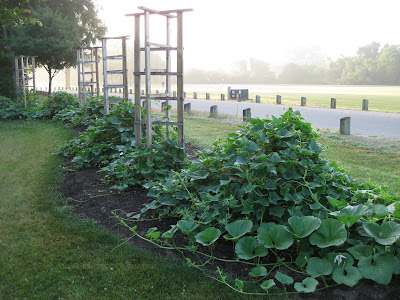 addition. This is the south entry in to the wishing well garden. We'll get some vines going up it and continue planting in the near vicinity. The carpenters do a nice job and the cost of that structure (simply materials with volunteer labor) is extremely affordable and much appreciated. The cucumber collection is really hitting stride over at the Horticulture Center. We have 20 varieties of pre--1920s cucumbers that Janice and her team planted back in early June. We are seeing lots of cukes forming. Below is the cucumber (