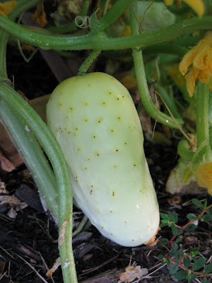 Cucumis sativus) called 'Boothby's Blonde' that is a white cucumber introduced way back in 1894. It will be neat to try these out. The bottom photo shows how well our little cucumber "tee-pee" supports have worked.
