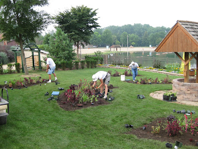 raccoons working through our dumpsters that past couple of nights. We're ready with our ramp though so they can scamper out as needed. Despite the fears that many people have regarding raccoons, I think they're cute (unless they're raiding our campsite...). It was muggy today but we kept plugging along. Janice, Big John, Ernie and Kay did a great job planting the wishing well garden beds (see below) that were well-prepared by Marv and Terry yesterday. They put in another 1000 annuals or so in the spaces that were just irises three days ago. Janice watered in the new plantings (and some containers) while John shifted to pushmowing. Kay continued weeding until lunchtime. Larry was the water boy again and ran irrigation, sprinklers and hit whatever containers Janice didn't get to before she had to leave. Little Jerry mowed and pruned here and there. He does a darn nice job and is very detail oriented.