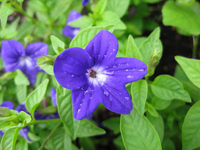 Browallia sp.) that is great in part sun in particular. Browallia comes in various shades of blue and also in white. We like to plant them in our dappled shade areas as they offer a nice blue throughout the growing season. The bottom photo is the perennial dune grass (