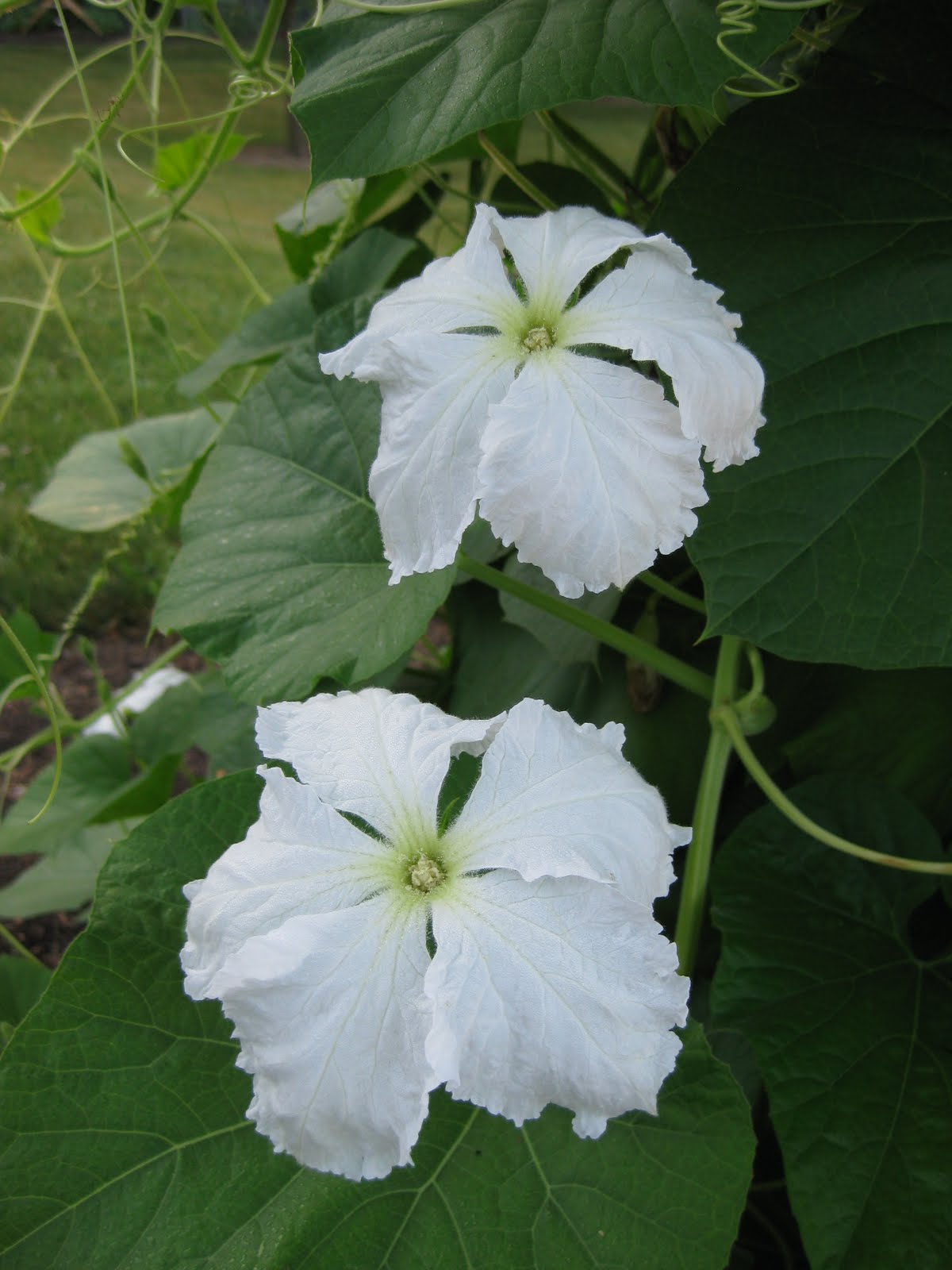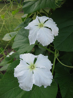 Lagenaria) that is right in front of where I park my car every morning at the Horticulture Center. I am totally smitten with the blooms and vigor of this annual vine. We'll see what a monster it becomes by the end of the season. The cucumbers are looking great and Doreen, a renowned garden writer, is coming this weekend to take some cuke photos. The annual below is the bush violet (