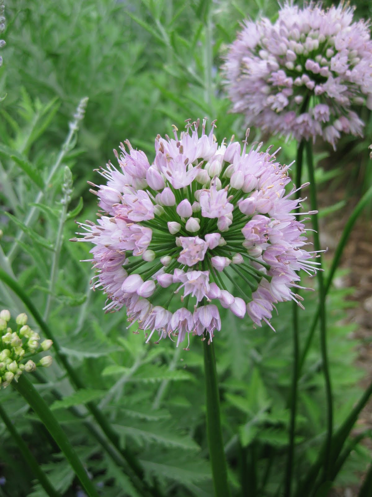 Allium tanguticum 'Summer Beauty') that really looks sharp thru the hottest summer months. 'Summer Beauty' also holds the spherical flower form well after the pink fades. The fruiting structures to the right are from the Italian arum (