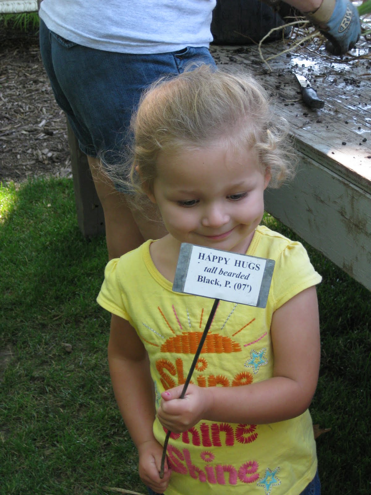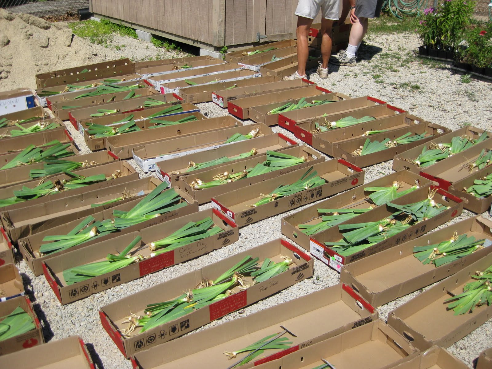 t to the horticulture center yard where they were processed by four members of the Madison Area Iris Society, led by John B. They needed to pull out rhizomes for their display garden and process all the irises that will be returned to the hybridizers (that shipping bill will be huge!). This stage was initially slow but Marianne helped expedite the process and the last stage for our irises was a dip in a bleach solution, drying and packing up in boxes. After an 8 am start, I was on the way by 12:30 pm with the truck and trailer (packed with irises) with Bob and Bev following in their car (also full of irises). We met Dan & Tom down in Beloit and unpacked the irises and arranged the boxes in Dan's cool and dry warehouse. We'll later process and further package these irises as we get near the sale date of August 28th. Nice shot to the left of Jumbo Jim who was a great help hauling irises through their various stages and he brought four RECAP ladies out to help as well. There's Lily to the right who was keeping her Grandma working hard at division. Below are Shirley and Sandy who were in charge of the bleach dip tanks (to sterilize the irises prior to storage). It was a great turnout and we fell in to a perfect rhythm. Special thanks to Big John, Marianne, Janice and Bev for helping coordinate this work day with so many volunteers. And of course, a big