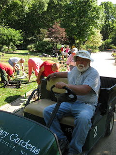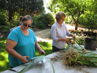 by a grounds staff member. Big John had the first group of 15 or so diggers in the wishing well garden. They made quick work of digging and cleaning those irises then the diggers moved to the iris planting near the arboretum. Stage 1 was the digging and rinsing, then the irises moved to the gazebo garden where Janice & Marianne helped coordinate the physical division of the irises (as seen above with Cindy and Alice). Marianne also supervised the diggers in the arboretum area. Processed irises in the gazebo then wen