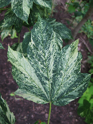 Larry worked on running irrigation, watering and pumping out the sunken pool to clean it up as well as the fountain pump. Little Jerry was here to mow and tidy up and Janice coordinated our volunteers and moved on to her own projects. We had a great weeding crew here of Glenna, Mary, Suzy and Marilyn. It is amazing how they can weed thru a large area so quickly (alleviating my stress at the same time about our weed problems). What a great team. The Grumpies were here as well. Big John, Bill, Pat, Bob C. and Ron worked on lifting irises in advance of our division and later assembled more of our tables. These are irises that we wont be selling that will be returned to the hybridizers. We're getting them out today so they aren't part of the general "dig and divide" this Saturday. We'll be spending tomorrow getting ready for this huge work day and are trying to minimize confusion early on in the process. Del and Charlie worked on regraveling paths while Jim, Vern and Dave worked on hanging gates on a new arbor. Bob T. worked on edging and we also saw Rollie, Maury, Doris and others. Another nice day. I took the afternoon off as tomorrow and Saturday will be challenging (since watering will be a priority too). Below are two more plants that have foliage as a primary feature. The vine is the golden silver fleece vine (