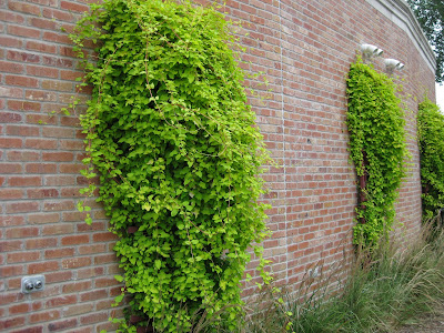 Fallopia aubertii 'Lemon Lace') that has really done a nice job softening this south-facing wall. We have five of these vining arbors secured along this wall and the gold really shows up from a distance. These will be covered with white flowers in late September. Beneath the Lemon Lace vine is a leaf of the variegated sycamore maple (