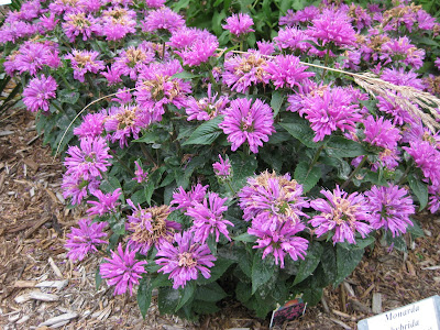 Monarda hybrida 'Petite Delight') which is a nice, compact, mounded form covered with blossoms. Many bee balms get tall and leggy (36"+) and are prone to powdery mildew (thereby losing many lower leaves over the summer). This variety is resistant to mildew but if you look closely, you'll see some whitish mildew starting on the leaves after that damp June. Still a remarkable variety in my mind.
