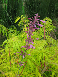 Agastache barberi 'Tutti Frutti') which is a tall perennial (just hardy, z5) for full sun and will get close to 48" tall. Here one of the stalks (with whorled, trumpet-shaped blooms for the hummingbirds) is adjacent to the Tiger Eyes sumac (