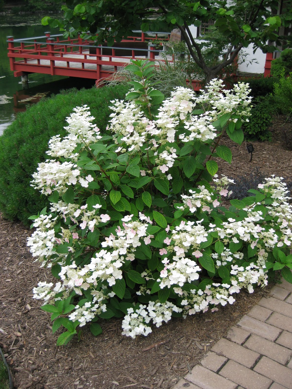 Hydrangea paniculata 'Bulk') that blooms weeks earlier than other panicled hydrangeas and gets the nice transitional color from this clear white to a nice pink, then to amber over the winter. Many visitors have asked about this plant as it is quite showy and highly recommended by me. To the right is a hyssop (