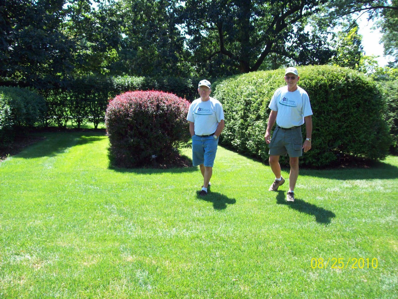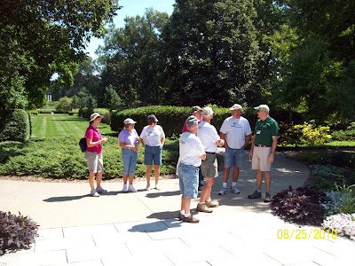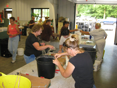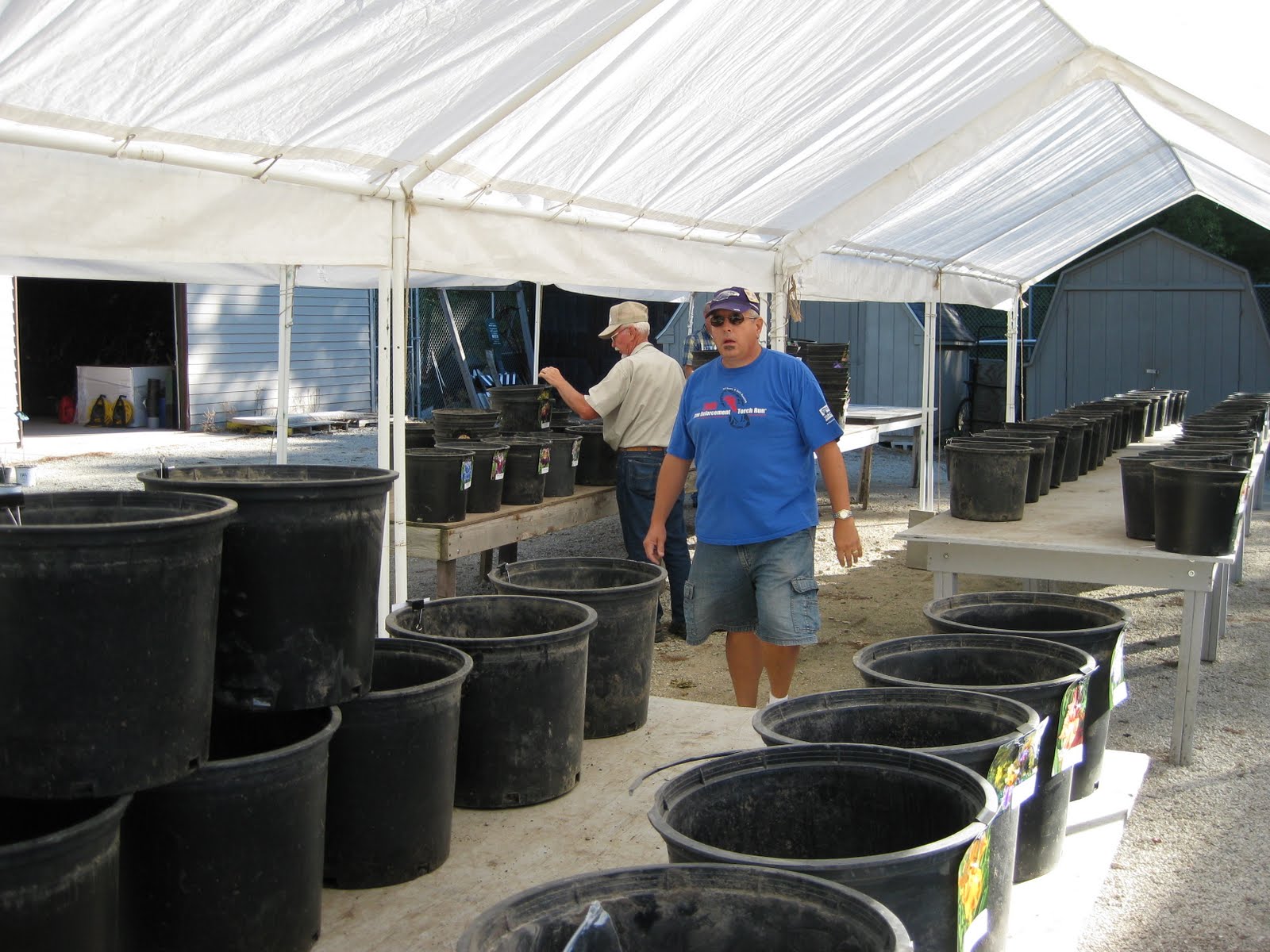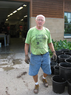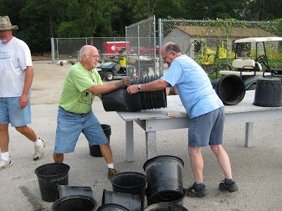 had 20 volunteers in the horticulture center, guided by Marianne and Janice, processing the irises to the final stage (to the right) prior to the sale next Saturday (August 28th, 10am-4pm). That day is also the 5th Annual Garden Festival (see our website for more info). The remainder of our volunteers went out and raked/collected leaves and debris from the gardens after the short but powerful storm last night. Larry, Bill and Big John got all three wedding sites tidied up and ready to go. Dr. Gredler was out mowing and Dr. Yahr was around as well. Below are Marv and Bob D. fighting over some containers. I appreciate their enthusiasm but wish they would have shared instead of this embarassing display. Actually, they had to separate 400+ containers that were nestled snuggly together.