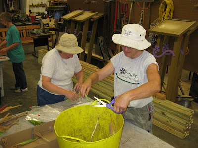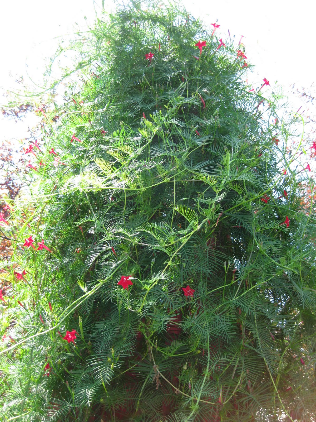 up of Grumpies with most of the guys working on graveling, leaf collection and carpentry this morning. Many of the guys later shifted to helping set-up tents for the iris sale this Saturday. Bob C., Del, Gary, Ron B., Charlie, Bob T., Pat, Bill kept busy while Dick P., Dick H., Maury and Big John worked on installing the venting system for our new laser engraver (see pictures towards the bottom). They ran in to some challenges but should have those resolved soon. Vern, Bob A. and Dave T. finished repairing our Japanese garden fence and moved on to other carpentry projects. Dr. Yahr and Dr. Gredler were here as well. Bill came in later to help mow too. To the left is the fine textured cypress vine (Ipomoea quamoclit) smothered with little red trumpets that are currently attracting the hummingbirds. This annual vine has worked its way up our red obelisks throughout our red/maroon theme. There is also a nice white and pink variety as well. To the right is the 'Fat Spike' amaranth (Amaranthus caudatus 'Fat Spike') with such interesting bloom clusters. Below is a nice cluster of variegated palm sedge (Carex muskingumensis 'Oehme') that I saw last Thursday at Six Flags Great America (Gurnee, IL). It was nicely contained and irrigated (essentials in the landscape). I was disappointed in their landscaping over all which looked "under attended". There were some nice containers but it has looked better in past years.