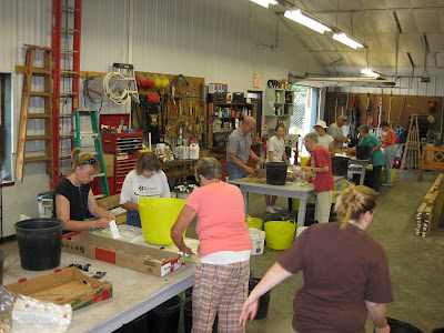 , these rhizomes were processed by our crack team in only three hours. We had to cut the irises back again and put them in labeled bags and finally in to their sale container complete with picture (for almost all varieties). Mary brought four female RECAPPERS and they were a huge help (picture further below). I was pleased with how smoothly everything ran and special thanks to Marianne and Janice who are so good with keep everything on task. Bev and her helper were ready with the labels and all steps of our process went quite nicely. More pictures below...