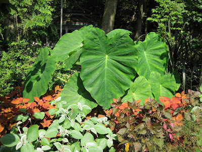 Larry spent the day running irrigation, watering and mowing. Big John, aside from his sign work above, worked on mowing, watering, fertilizing and some odds and ends. Janice did a lot of watering and came in later to pick some gourds for the upcoming Garden Festival (also this Saturday the 28th, 11am-4pm). Kay was here to weed and tidy up and Dr. Gredler was out doing a nice job with his mowing. We also saw Kay F., Dr. Yahr and many others stopping by as well. Tomorrow is our ground staff "day trip". We're going to a home garden in Waukesha that we visited many years ago and were very impressed. Dale's one acre garden is meticulous and features expansive moss gardens, containers, water features, a formal garden, rockery, etc. Unbelievable. I've mentioned Dale in past posts as "Mr. Moss" for his talents. We'll then travel down to the Morton Arboretum in Lisle, IL (Chicago suburbs) which is one of the top 5 arboretums in the country. We'll get a tour, have lunch, and do the tram ride around 1700 acres of collections and gardens. I grew up in the Chicago suburbs and my dad dragged my two brothers and me to the arboretum as kids. We sure resented him taking us out in to nature (for goodness sake!) but it is now one of my favorite destinations and a wonderful place to visit for relaxation, education or both. The "Morton" is tied to the Morton Salt company. Interesting history worth looking in to. They have a neat new children's garden and their display gardens continue to expand and improve. Looking forward to it and I should have some sweet shots for the blog tomorrow night. Nice shot below of elephant ear (Colocasia esculenta) looking bold near the gazebo garden. This is another "can't do without" tropical for the full sun or part shade garden (needs lots of water!).