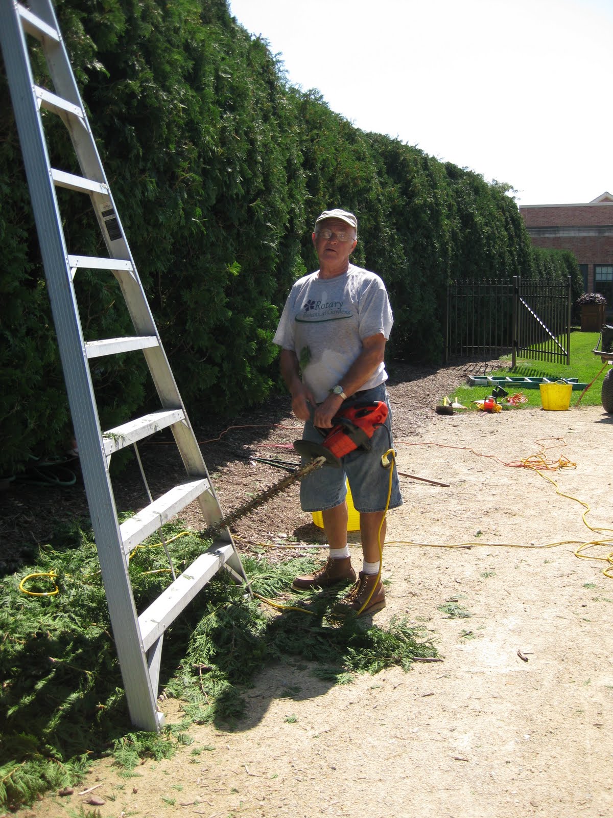 nce of rain tomorrow. Marv and Terry did a great job pruning the arborvitae (Thuja sp.) hedge that separates the formal gardens from the terrace and wishing well gardens. This is a MONUMENTAL task and the guys spent the majority of the day shearing away. Marianne and I wo
