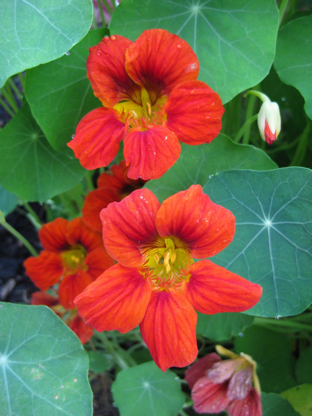 Duranta erecta 'Golden Edge') that has such a visual presence. We use this tropical in containers and bedding schemes every year. To the right is one of our red-blooming nasturtiums (