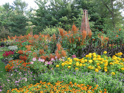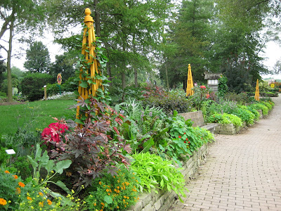 Tropaeolum sp.) along our ornamental edible wall. With edible blooms and leaves, this annual is east to grow in containers or beds. Speaking of the ornamental edible wall, there it is below. We've had plenty of questions regarding the plants along this wall and I hope to get additional signs up along its length. Landscaping with ornamental edibles is still a very hot gardening topic of possible interest. At the bottom are more of our annual beds in composition. Note the repetition of the grain amaranth (
